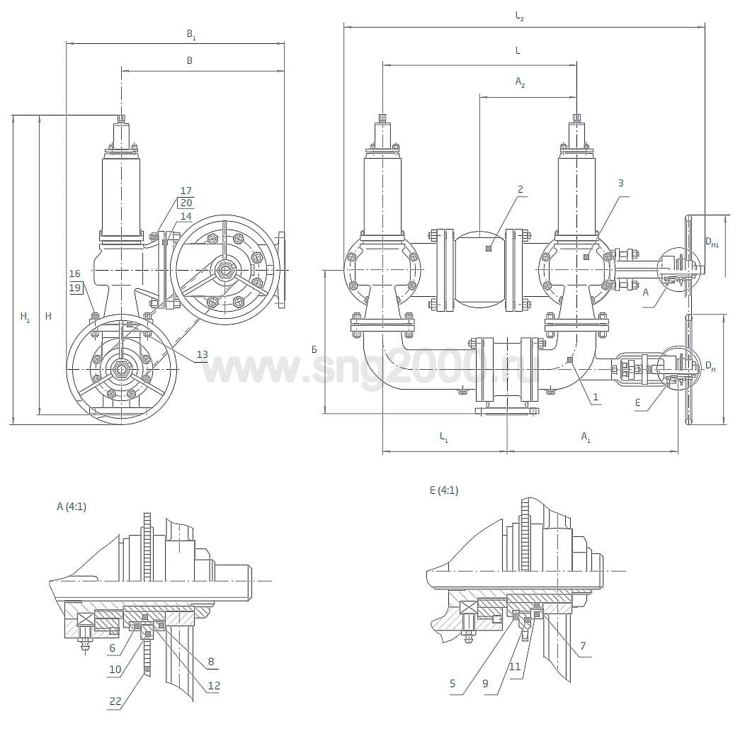 Блоки предохранительных клапанов оснащены устройством контроля синхронности перемещения запорныхорганов обоих переключающих устройств, т.е. отключение одного предохранительного клапана и подключение другого, что необходимо для безопасности.